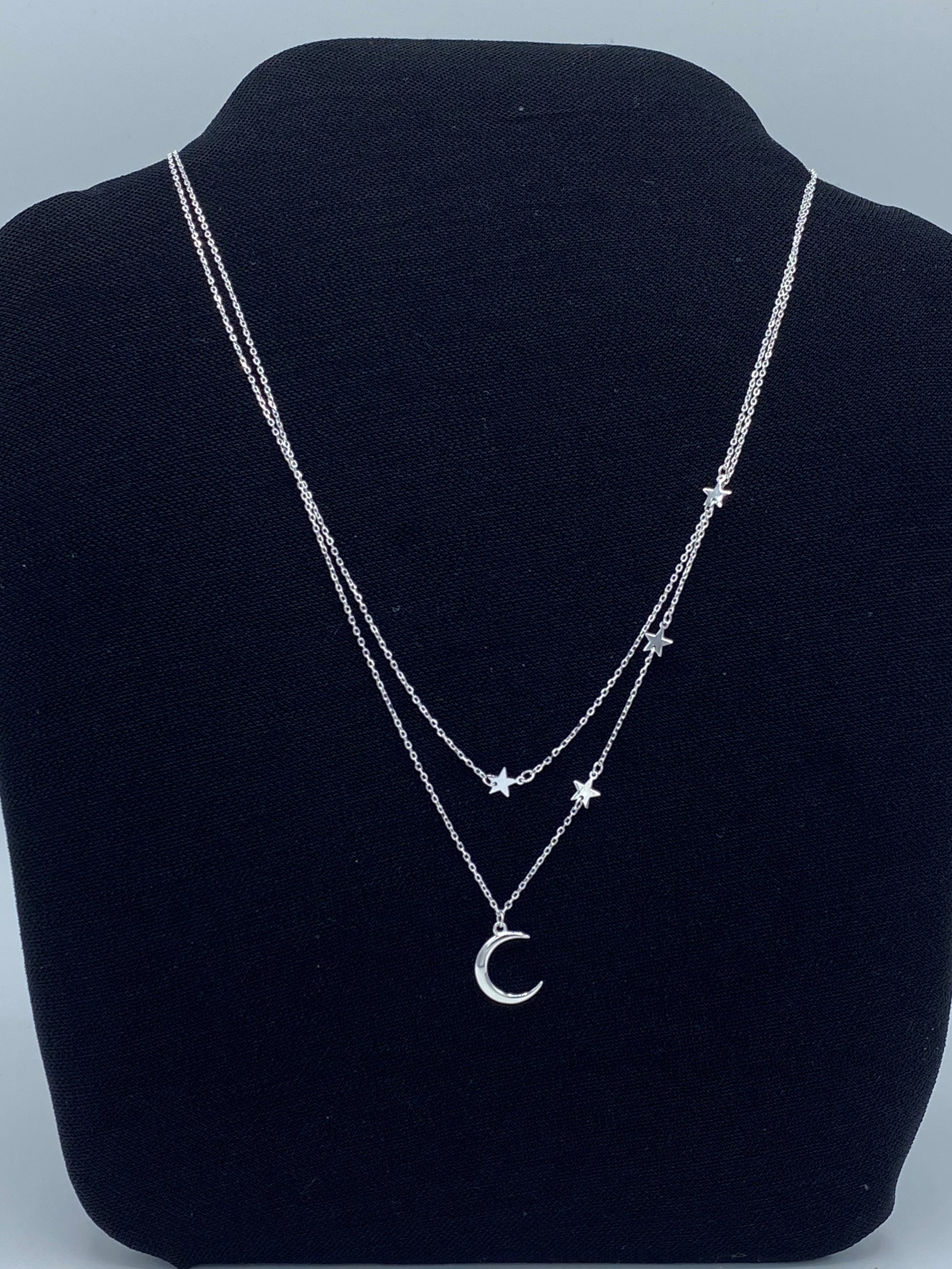 Collana anallergica con doppia catenina in argento, una con stelline e mezzaluna pendente in argento, l'altra poco più corta con un'unica stellina. Chiusura a moschettone, la catenella permette la regolazione della misura. Dal design semplice ma raffinato, la collana Luna e Stelle è l'accessorio ideale per un utilizzo quotidiano o per una serata speciale. Lo stile della collana è perfetto per accompagnare sia un look casual che un outfit elegante.